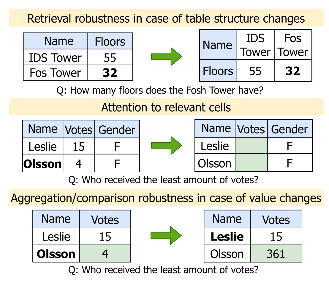 - This work focuses on the robustness issues of TQA systems that are crucial in real-world applications, e.g., the interaction with relational databases and information extraction.