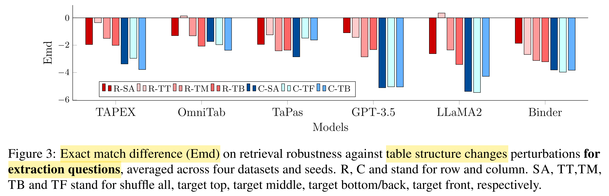 - Create FREB-TQA, a novel English benchmark for fine-grained analysis of three aspects of the robustness of TQA systems, i.e. (a) retrieval robustness in case of table structure changes; (b) robustness against intrinsic knowledge or positional biases; (c) aggregation / comparison robustness in case of value changes.