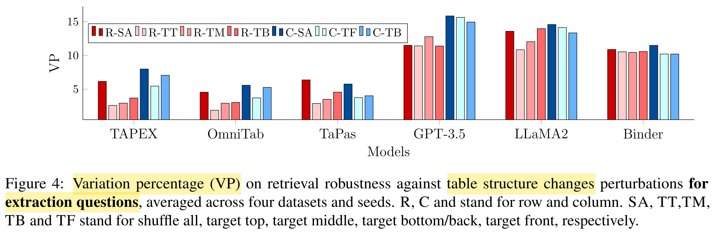 - This work evaluates two classes of TQA systems which have different mechanisms and complete the task in different manners, facilitating the investigation of the impact of system architecture on the robustness.