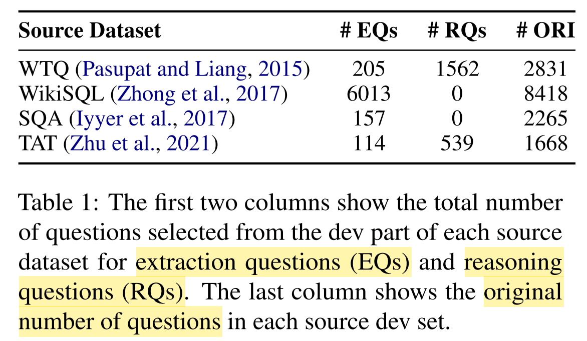e.g., “What is the name of the actor in the first row?“ - Step 3: Group questions into Extraction Questions (EQs) and Reasoning Questions (RQs)