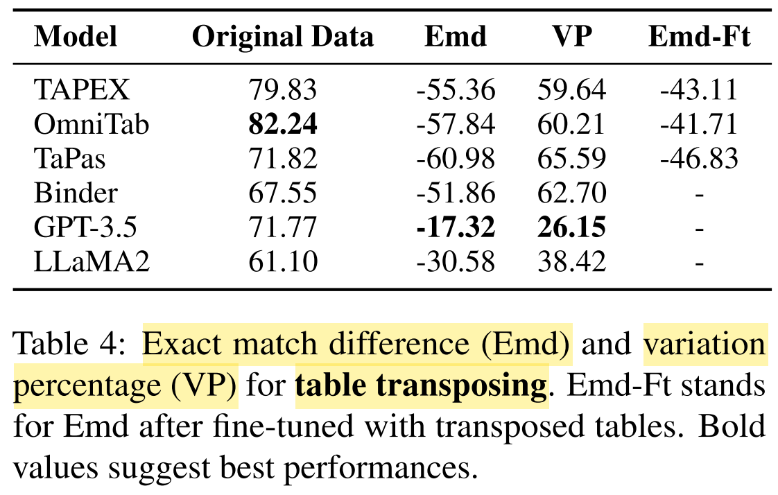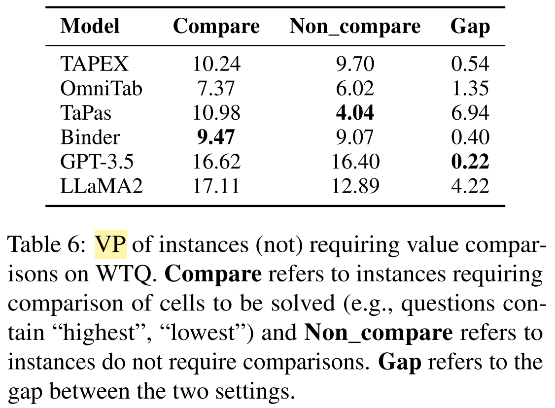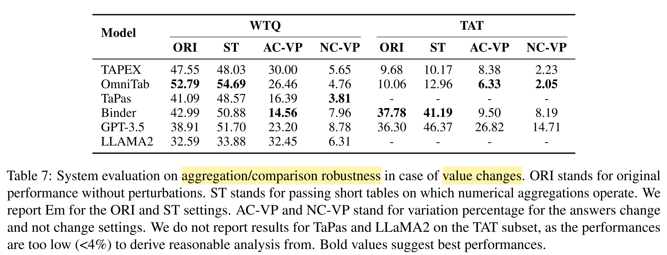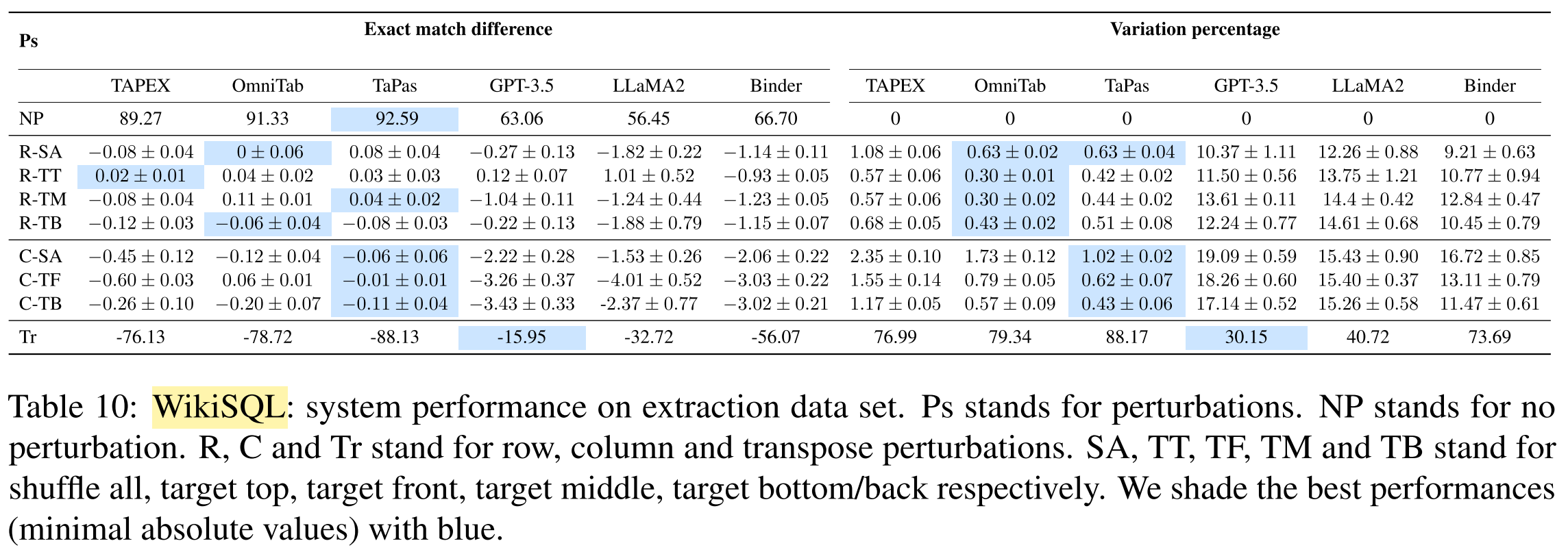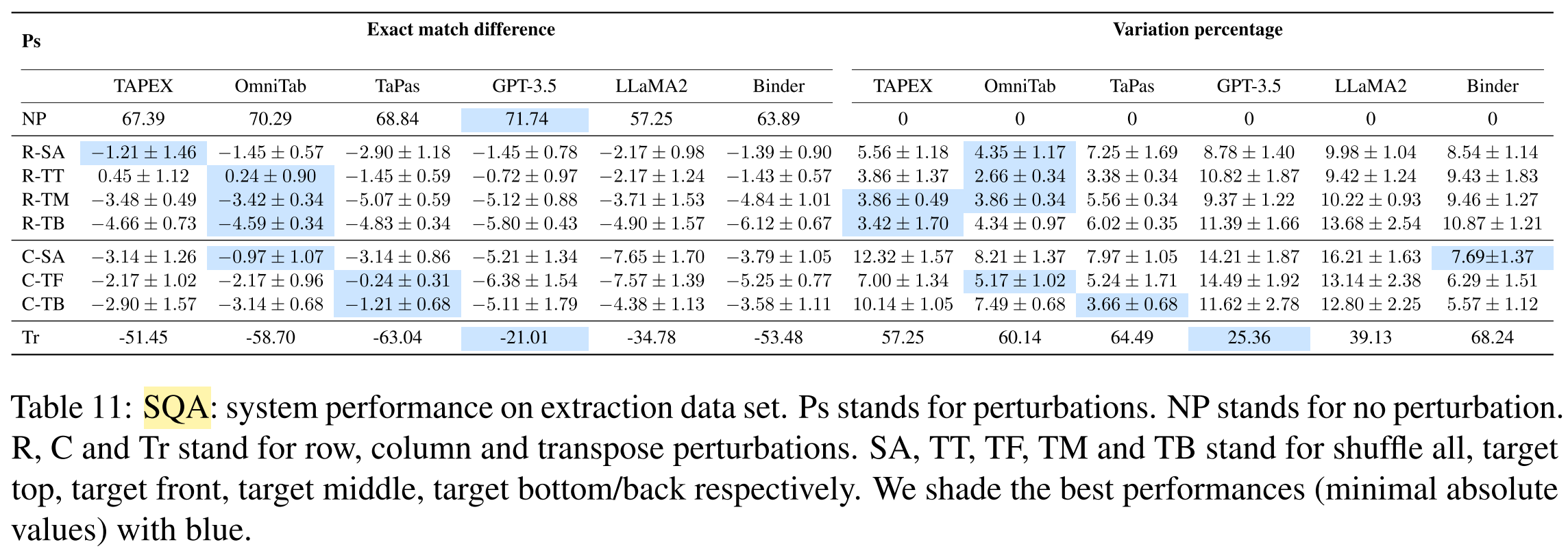 - This work only evaluates general LLMs, i.e. GPT-3.5 and LLaMA-7b-chat, which were pre-trained on plain texts. Further evaluations could be done using LLMs specifically trained on the TQA task, which are equipped with a specific table encoder.