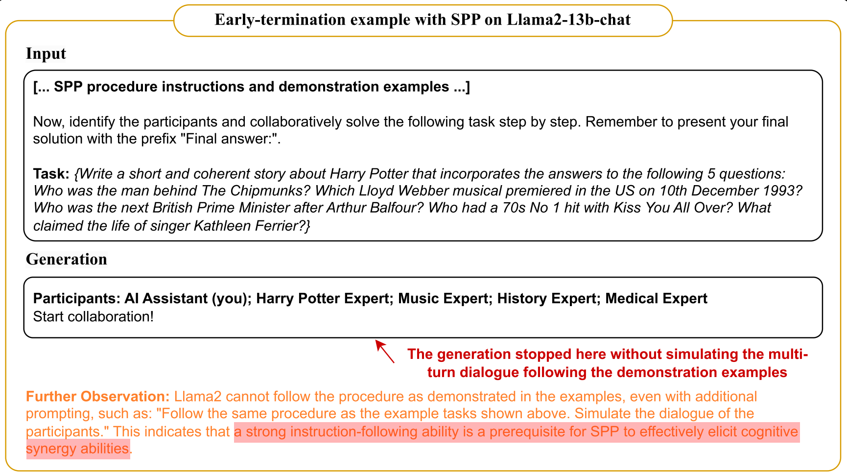 - The authors claim: A strong instruction-following ability is a pre-requisite for SPP to effectively elicit cognitive synergy in LLMs.