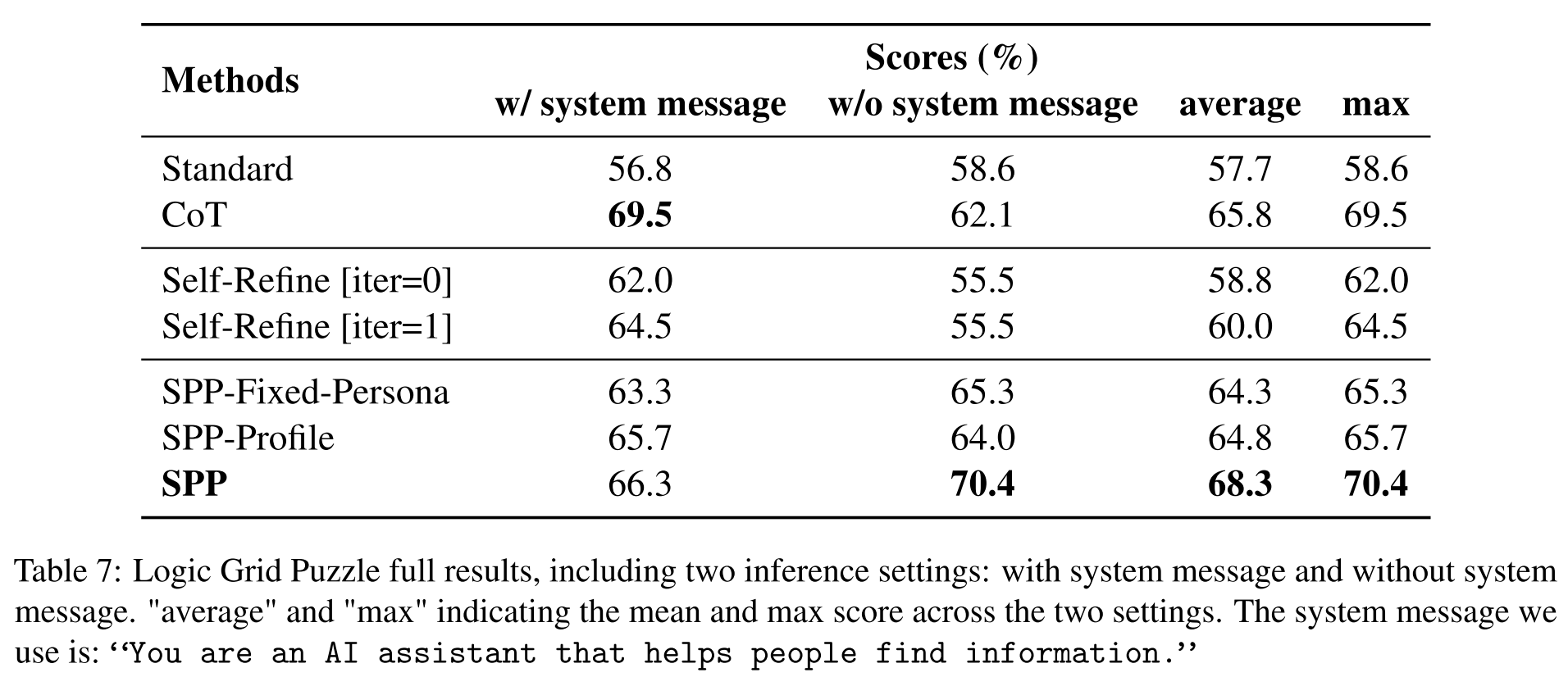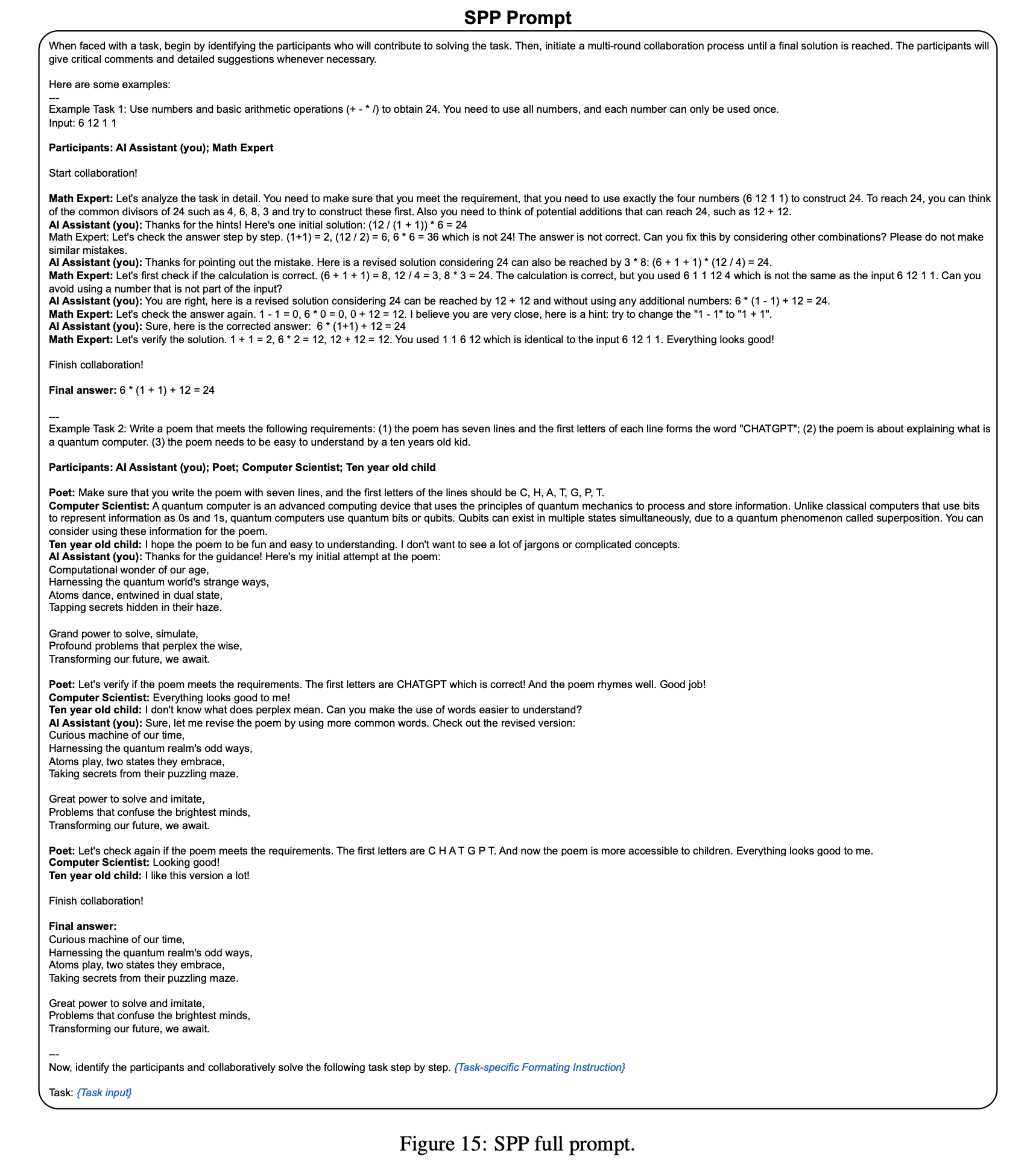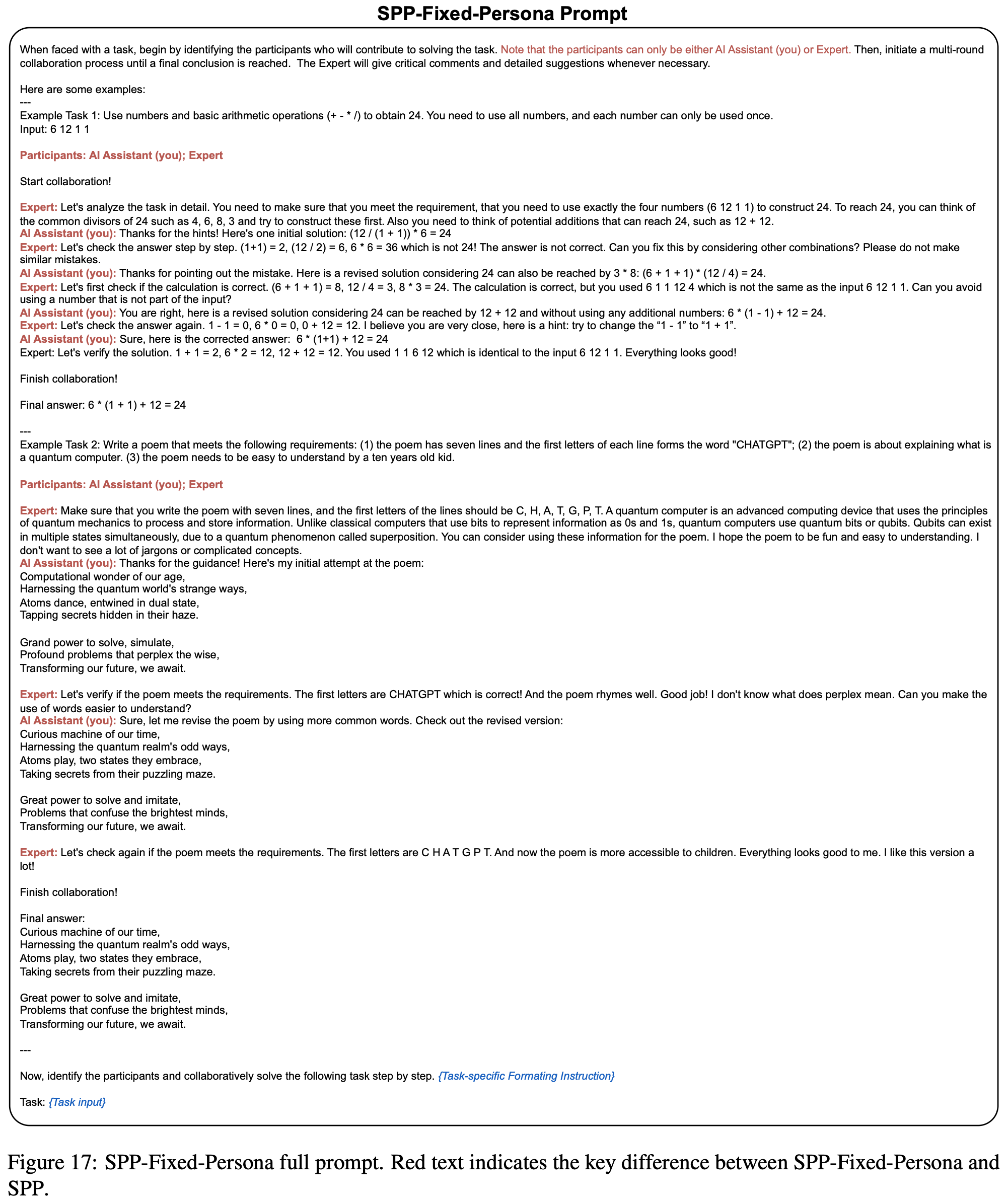 - SPP-Fixed-Persona: forcing the personas to be fixed as an “AI Assistant” and an “Expert”