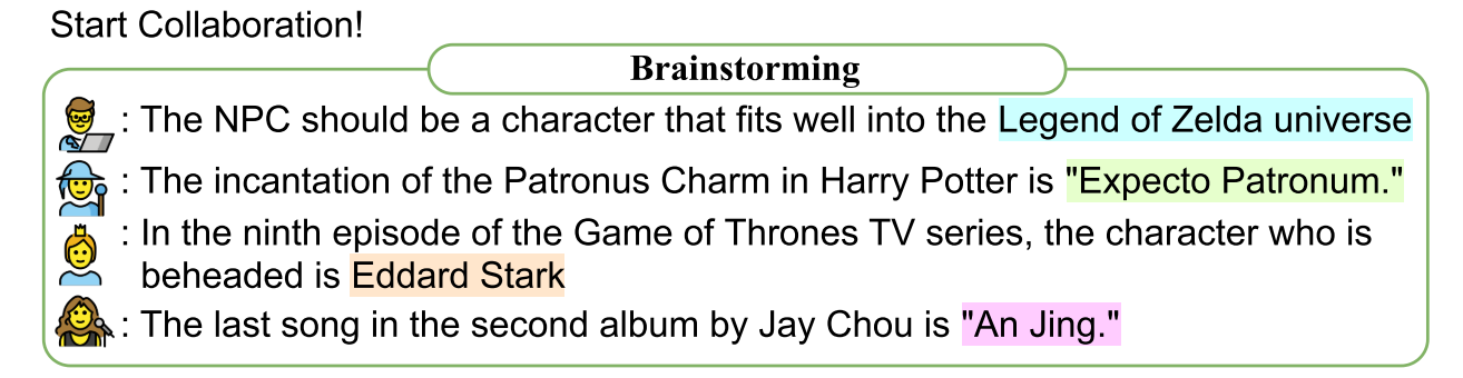 - Output: intermediate generations of personas’ brainstorming results on how to approach the task from their own perspectives