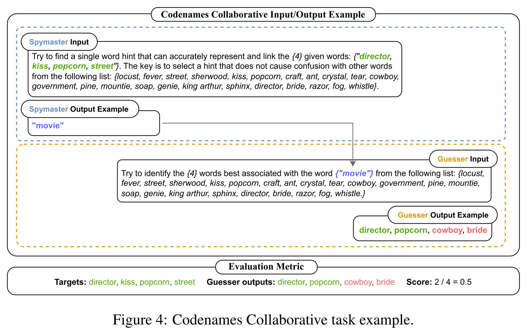 - evaluation metric: overlapping ratio between predicted words (Guesser) and target words (Spymaster)