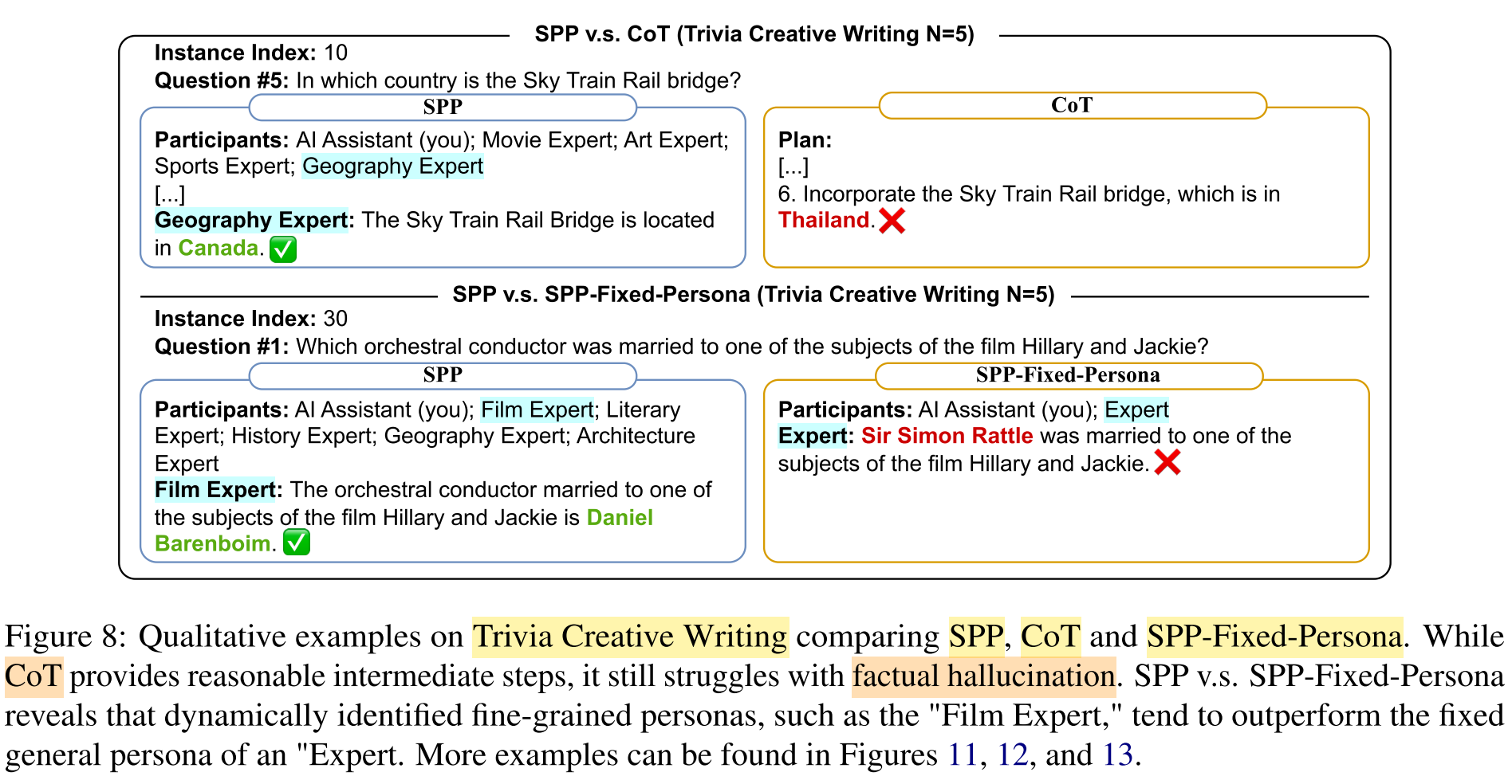 The factual hallucinations are observed in the final output generated using CoT prompting in the knowledge-intensive Triva Creative Writing task (cf. Figure 8, 11).