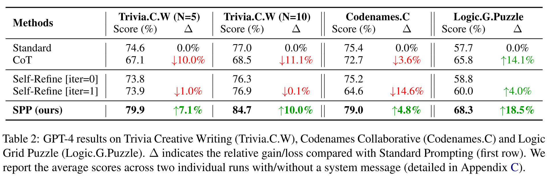 Logic Grid Puzzle: SPP > CoT > Self-Refine [iter=1] > Self-Refine [iter=0] > Standard Prompting