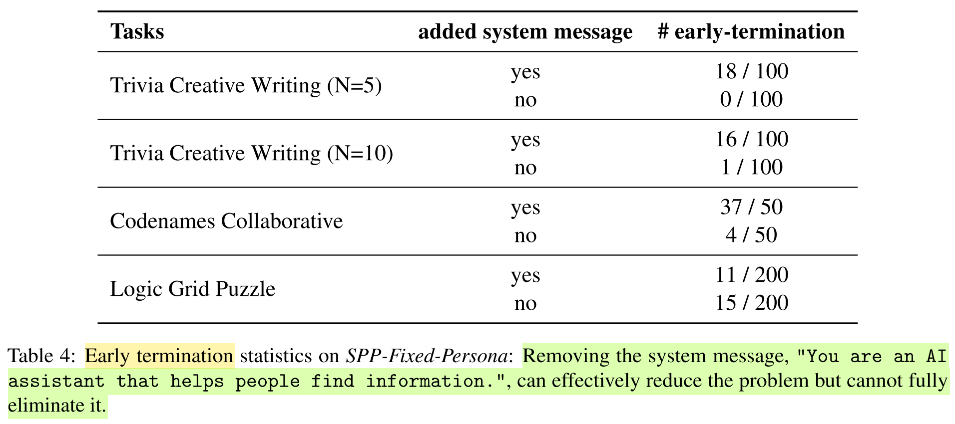 - Removing the system message can effectively reduce the early-termination problem, but cannot fully eliminate it.