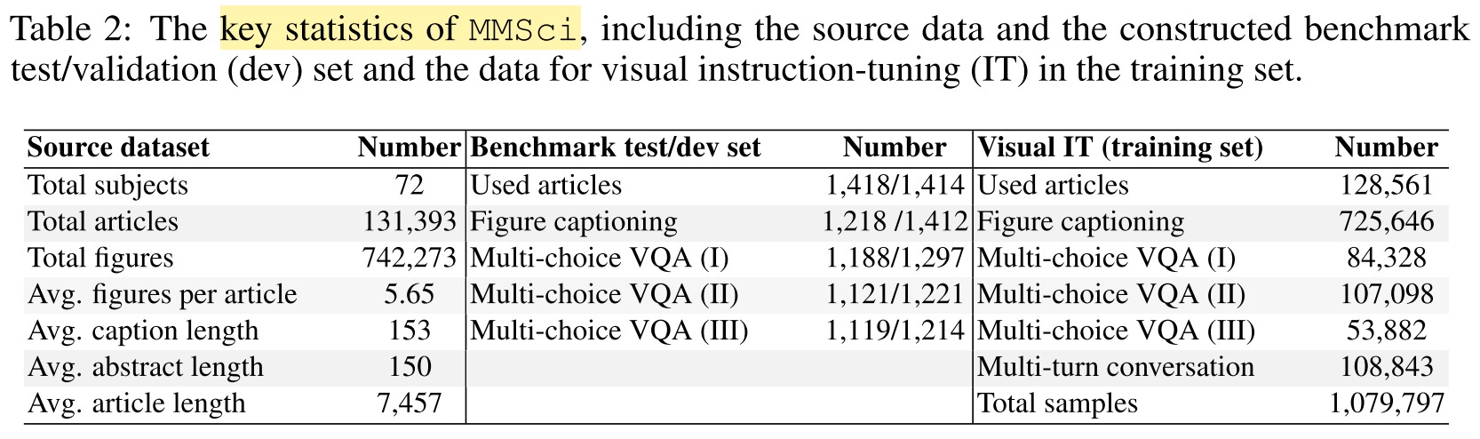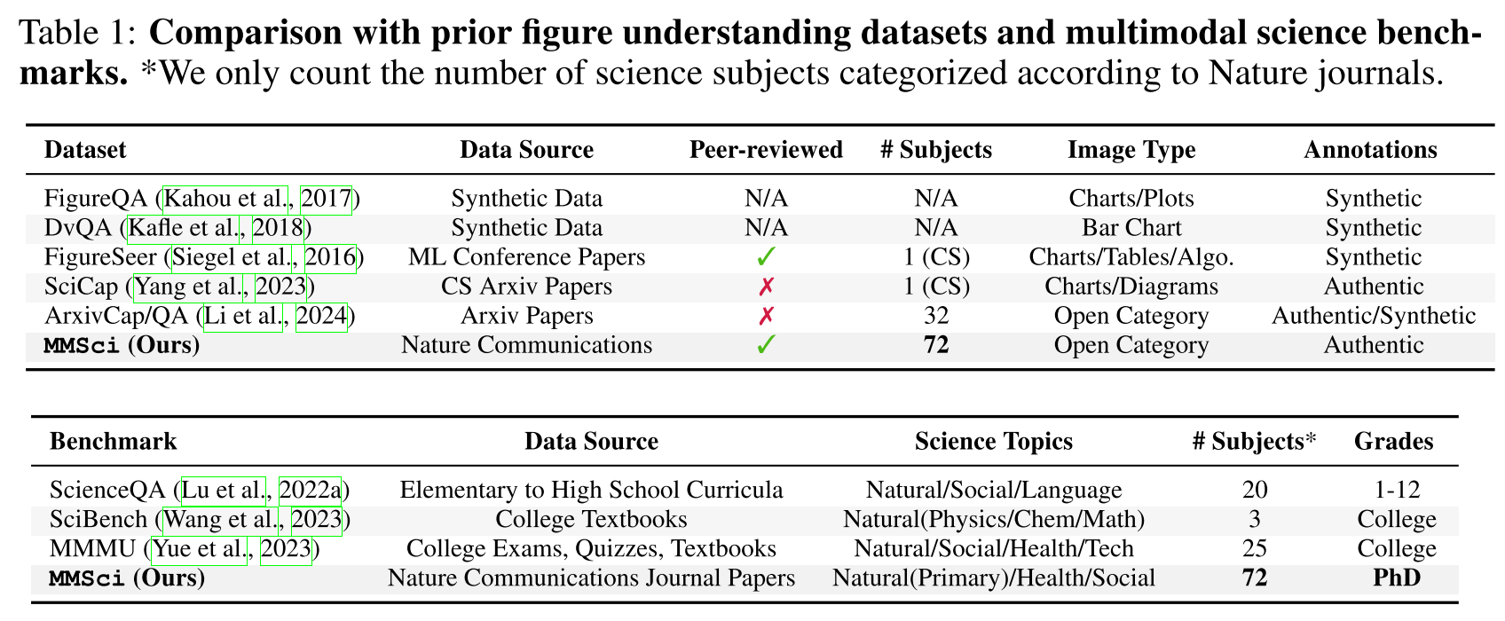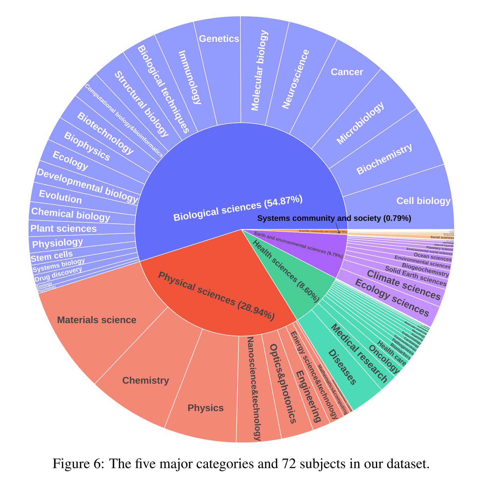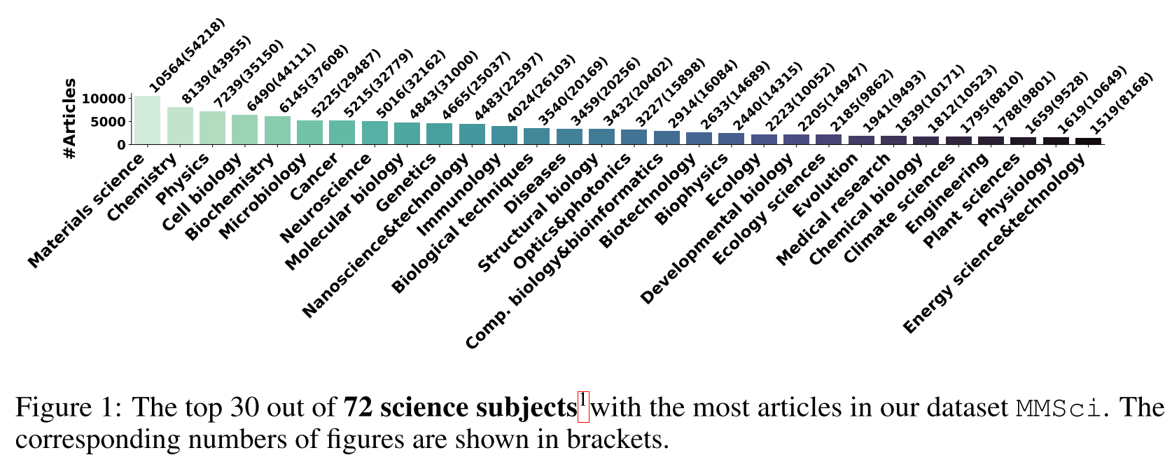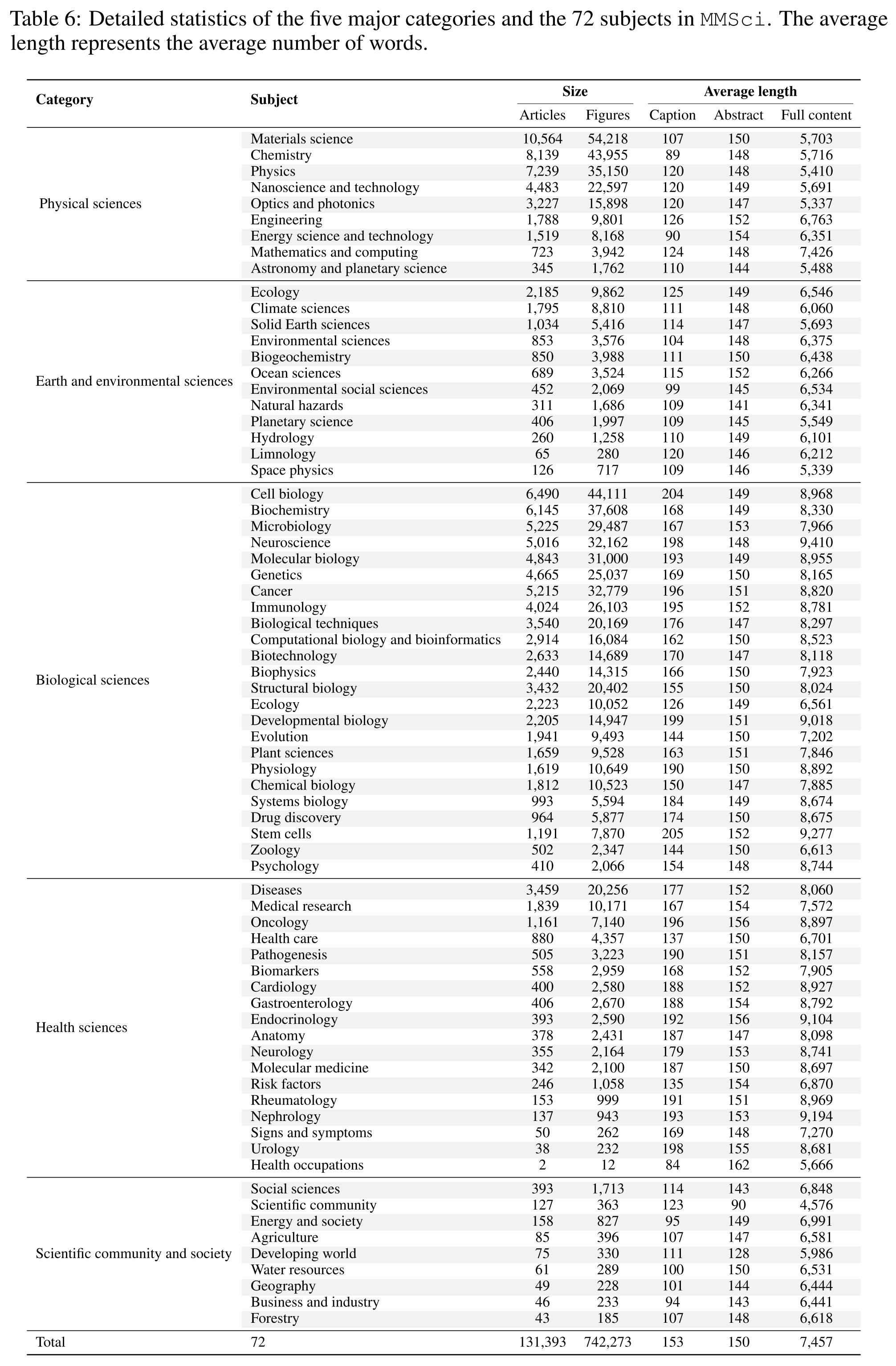 - This paper releases MMSci, a multimodal multi-discipline dataset spanning across 5 major scientific categories and 72 subjects.