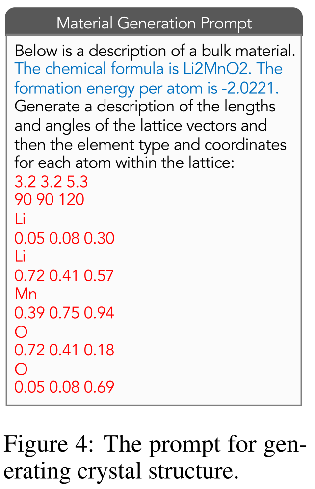 - Further fine-tune the LLM part of the model for material generation task (Gruver et al., 2024).