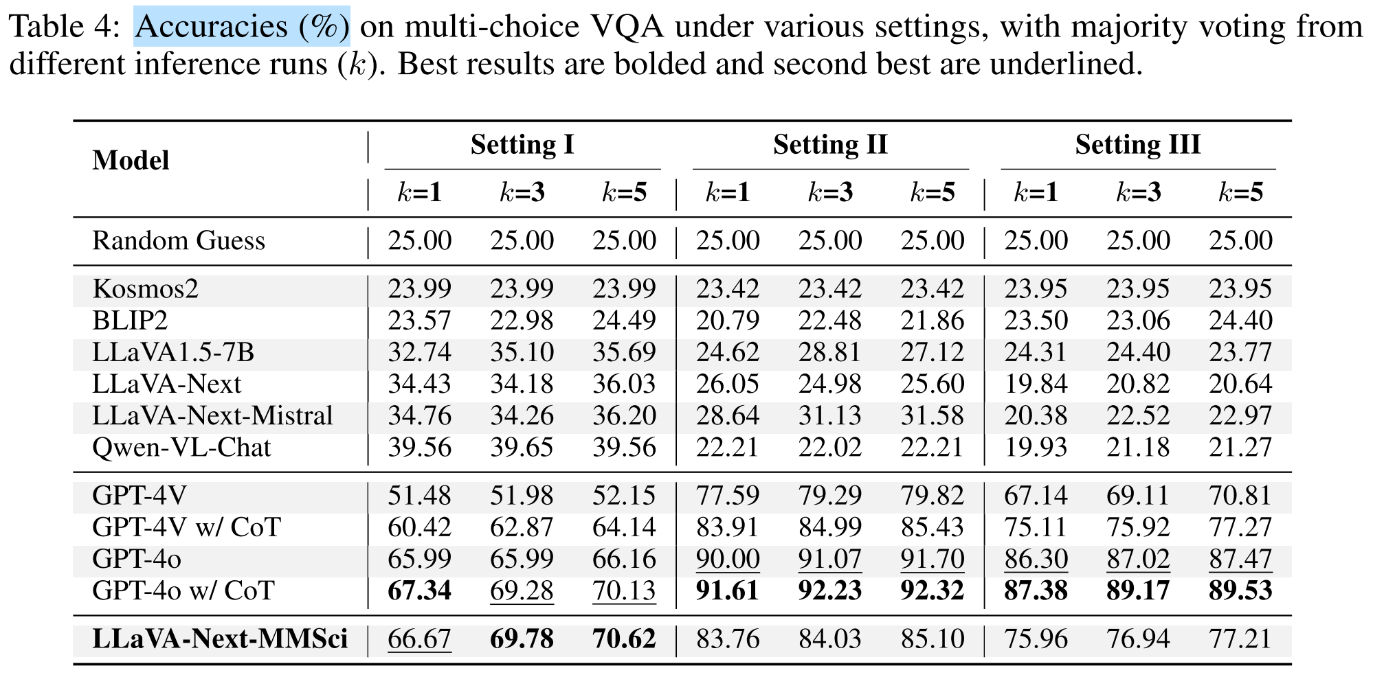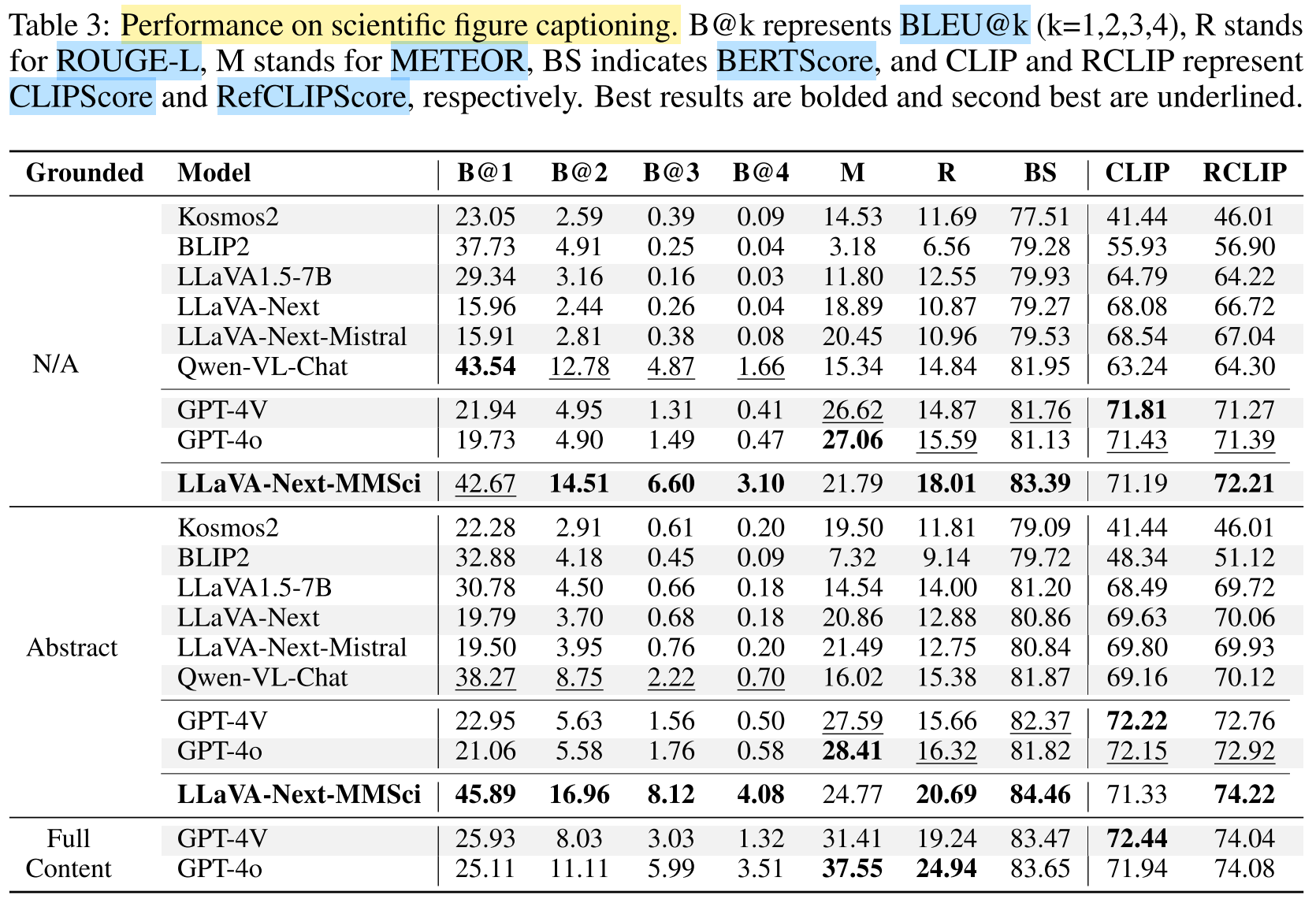 - Providing only the abstract content or no article information, open-source models show significantly lower performance, instruction-tuned model (LLaVA-Next-MMSci) achieves achieves the best results across most metrics.