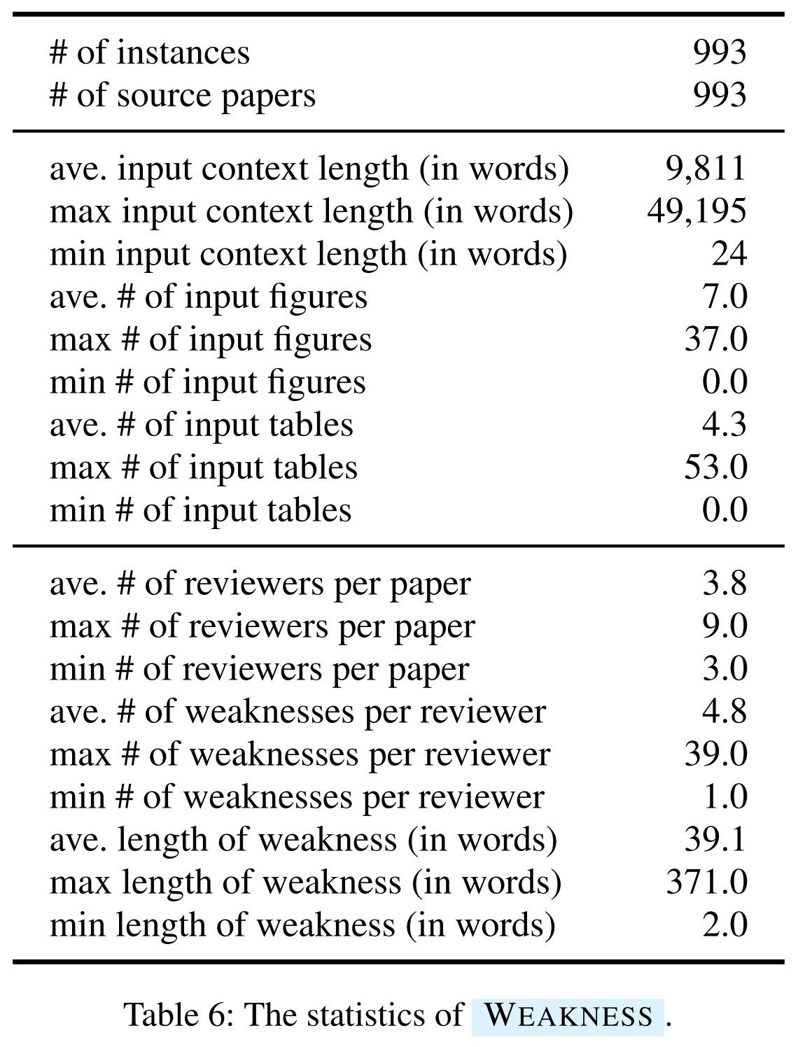 , where : LLM-generated experiment plan, of length (number of experiment steps) : ground-truth plan, of length , where : number of reviewers for the given paper : length of the weakness list given by the -th reviewer : the -th item in the weakness list given by the -th reviewer : total number of papers in the dataset : the -th paper’s prediction weakness list : the -th weakness in calculates the intra-paper occurrence frequency of , measures informativeness is the “soft” number of papers that also contain , measures specificity