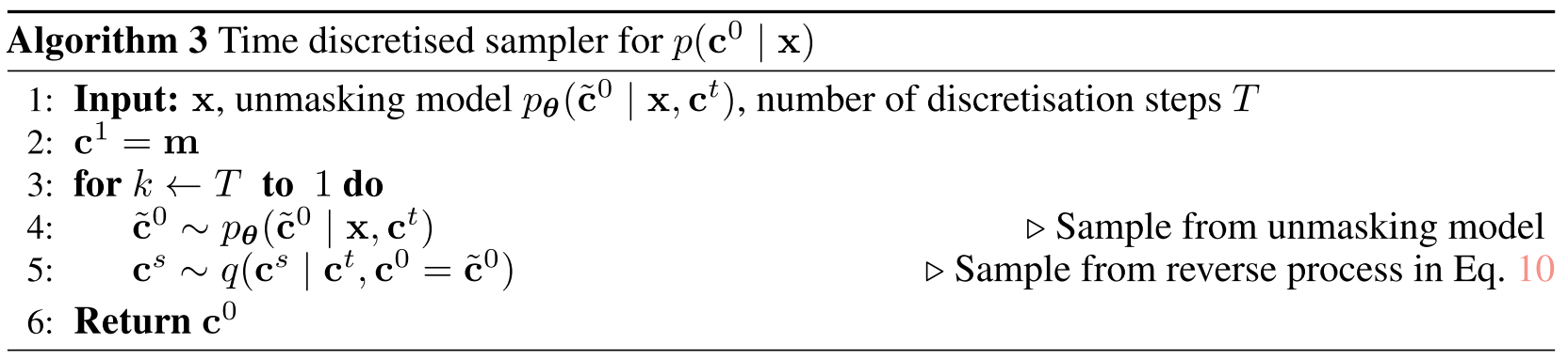 Backward denoising (parametrized and trainable): Start with a fully masked data point, gradually unmask dimensions by assigning values in the label space. Then, remask some dimensions using the reverse posterior: