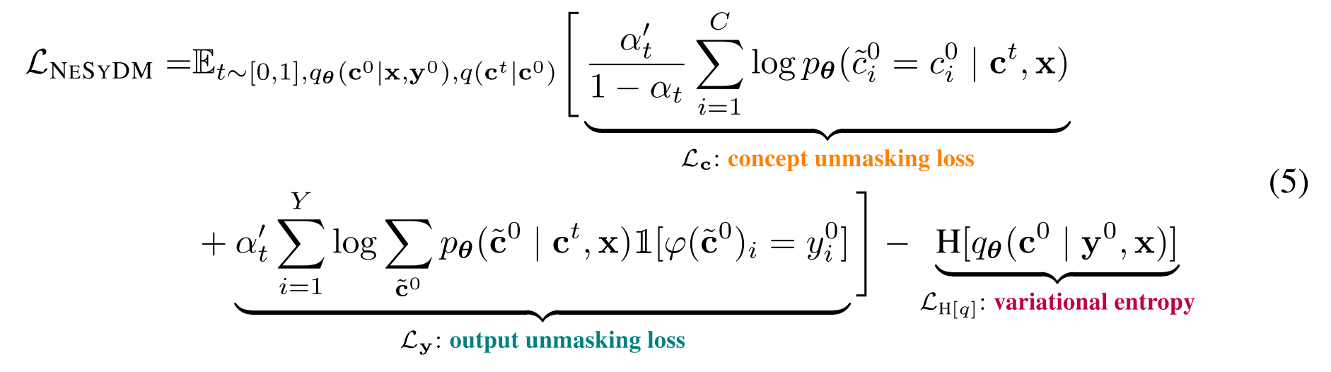 The concept unmasking loss is like the unmasking loss used in MDMs. Since we do not have access to the ground-truth concept , we sample it from the variational distribution and ask the model to reconstruct from a partially masked version .