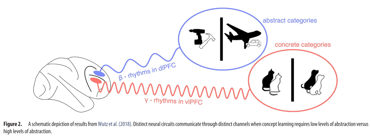 - Distinct neural circuits (vlPFC vs. dlPFC) communicate through distinct frequency channels (gamma vs. beta) and at different times (sample vs. delay epoch) when inferring regularities about the world on low- vs. high-levels of abstraction.